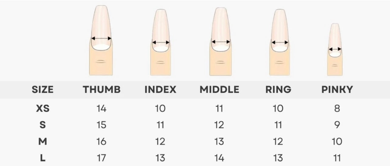 To find the set size right for you, use a measuring tape or ruler to measure the widest part of each nail in millimeters, then match your measurements to our sizing chart above.